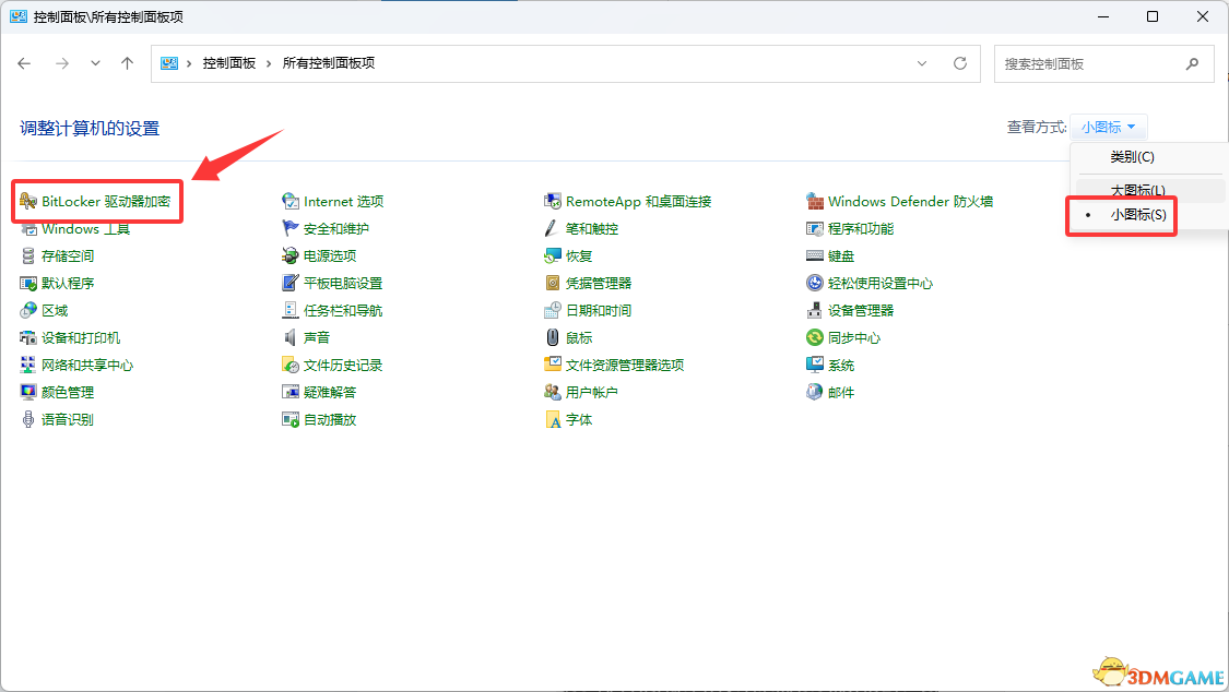 1.打开控制面板 右上角查看方式切换为小图标 找到“Bitlocker驱动器加密”